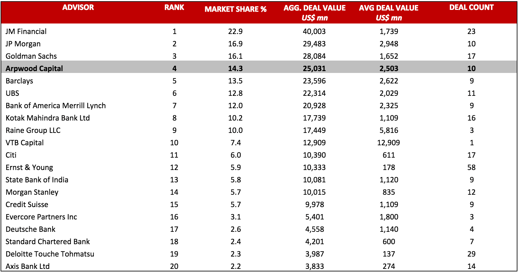Ranked #5 in Bloomberg’s Indian M&A League Tables 2016-2022.